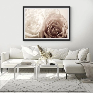 - Postern visar fina krämfärgade rosor i närbild, vilket betonar deras subtilitet och elegans. Denna romantiska komposition i pastellfärger passar perfekt för harmoniska interiörer.