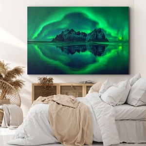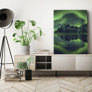- En målning som föreställer berg omgivna av magiskt norrsken som speglas i vattnet. Ett idealiskt dekorativt element för att skapa harmoni och skönhet i naturen i interiörer.