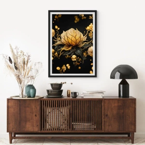 - Denna poster, med en gyllene blomma mot en djupsvart bakgrund, utstrålar elegans och lyx. Färgkontrasten och de noggranna detaljerna ger den en unik karaktär.