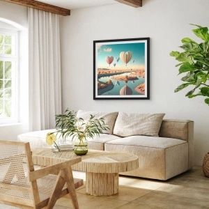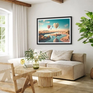 "Kärleken låter dig sväva" är en unik poster som visar en sagolik miljö där hjärtformade ballonger svävar över ett fridfullt landskap. Fina reflektioner i vattnet ger harmoni till kompositionen, och pastellfärger betonar bildens subtilitet och romantiska atmosfär.