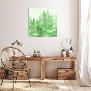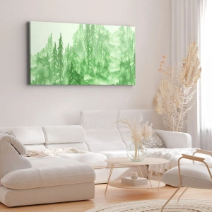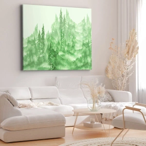 - En canvastavla som föreställer en subtil grön skog i akvarellstil mot en ljus bakgrund. En perfekt dekoration för att skapa harmoni och lugn i alla interiörer.