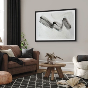 - En minimalistisk poster som visar uttrycksfulla penseldrag i svartvita nyanser. Den enkla men dynamiska designen passar perfekt för moderna inredningar.