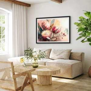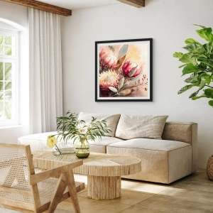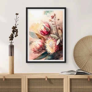 Affisch i svart ram - En bukett proteablommor i delikata färger - 50x70cm - Från profil och en face - Modern väggdekoration för vardagsrum och sovrum ARTTOR