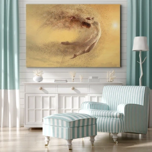 Målningen "I dansens hänryckning" är ett unikt verk som kombinerar rörelsens dynamik och det konstnärliga uttryckets subtilitet. Den avbildar en figur i ett dansande hopp, omgiven av en sönderfallseffekt som ger kompositionen en lätthet och flyktighet. Bakgrunden i varma gula nyanser betonar energin och känslomässigheten i denna scen, vilket gör målningen till ett idealiskt val för moderna interiörer.