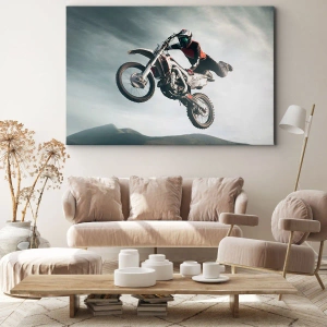 Canvastavla - Bild på duk - Motorcyklist i luften under ett hopp - 70x50cm - No risk, no fun - Modern väggdekoration för vardagsrum och sovrum ARTTOR