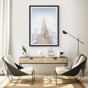 - Denna stämningsfulla poster föreställer en ensam figur som vandrar längs en stig bland lugna vatten. Den minimalistiska kompositionen i nyanser av blått och beige skapar harmoni och uppmuntrar till reflektion.