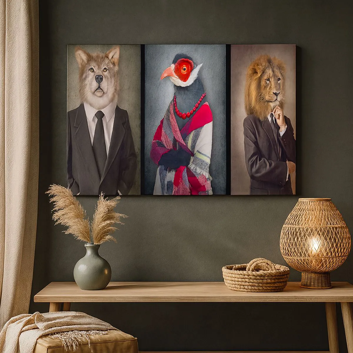 - En humoristisk målning med stiliserade porträtt av en varg, en fasan och ett lejon i eleganta dräkter, perfekt för moderna interiörer.