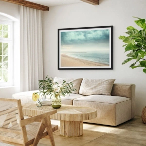Affisch i svart ram - En ensam gestalt vandrar längs havsstranden under en mulen himmel. - 50x70cm - På jakt efter frid - Modern väggdekoration för vardagsrum och sovrum ARTTOR
