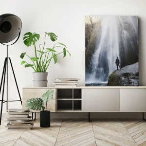 Canvastavla - Bild på duk - En figur mot bakgrund av ett majestätiskt vattenfall i en klippig klyfta - 70x50cm - Proportioner återställs - Modern väggdekoration för vardagsrum och sovrum ARTTOR