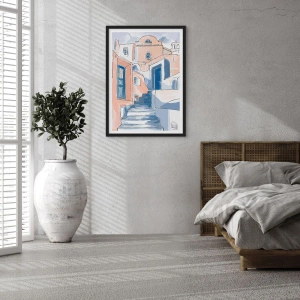 Det arkitektoniska motivet hänvisar till pittoreska grekiska städer som Santorini eller Mykonos, där smala gator och karakteristiska byggnader skapar en unik atmosfär. Det konstnärliga tillvägagångssättet i en akvarellillustration ger målningen en unik karaktär som harmoniserar harmoniskt med medelhavs-, bohemiska eller skandinaviska interiörer.