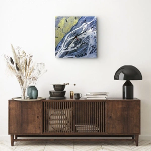 Väggklockan "Naturens klippmålningar" presenterar ett fascinerande landskap ur fågelperspektiv – sammanflätade flodbäddar och sediment bildar en naturlig, abstrakt komposition. Blandningen av färger – intensivt blått, vitt och livfullt gult – skapar en visuell rytm som påminner om ett modernt konstverk. Denna dynamiska skildring av naturen visar dess komplexitet, skönhet och organiska ordning.