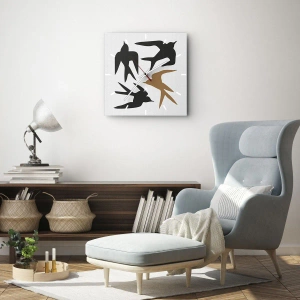 Väggklocka - Klocka på glas - Svarta och guld silhuetter av svalor på vit bakgrund - 30x30cm - Svalornas lek - Modern väggdekoration för vardagsrum, kök och sovrum ARTTOR