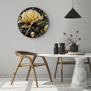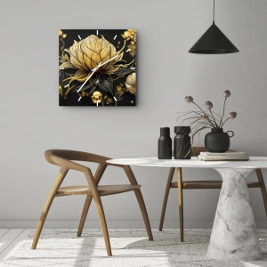 Väggklocka - Klocka på glas - Guld- och svartblomma på en mörk bakgrund - 30x30cm - Subtil skörhet - Modern väggdekoration för vardagsrum, kök och sovrum ARTTOR