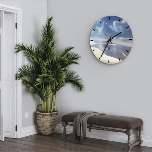Väggklockan "Paradise Holiday" avbildar ett fridfullt och vidsträckt strandlandskap som inbjuder dig att varva ner och koppla av. Den ljusa stranden, de lugna vågorna och den blå himlen skapar en harmonisk semesterscen full av naturligt ljus och värme. Bilden fångar perfekt atmosfären av bekymmerslösa stunder vid havet.