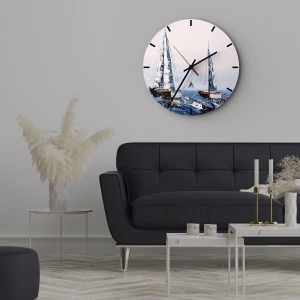 Väggklockan "Vindens brödraskap" transporterar betraktaren till hjärtat av ett maritimt äventyr. Dess urtavla avbildar två segelbåtar som flyter på ett stormigt hav, fångade i en dynamisk målerisk stil. Segel som sväller av vinden, plaskande vågor och en intensiv palett av blått och vitt skapar en komposition full av rörelse, energi och en maritim anda.