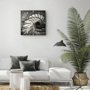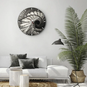 - En väggklocka i glas, 30x30 cm, med ett svartvitt fotografi av en spiraltrappa som går ner. En geometrisk och rumslig dekoration med en minimalistisk känsla.