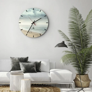 Väggklocka - Klocka på glas - En ensam figur vandrar längs havsstranden under en molnig himmel. - 30x30cm - På jakt efter frid - Modern väggdekoration för vardagsrum, kök och sovrum ARTTOR