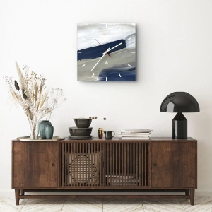 - Denna väggklocka på 30x30 cm har en abstrakt komposition i nyanser av vitt och marinblått. Minimalistiska penseldrag skapar ett kontrasterande och modernt motiv.