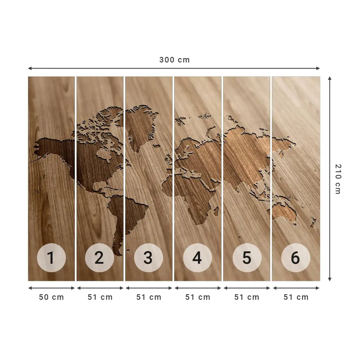 Självhäftande Fototapet Deluxe Sticker - Världen serverad på bordet - Världskarta, Trä, Kontinenter - 300x210 cm