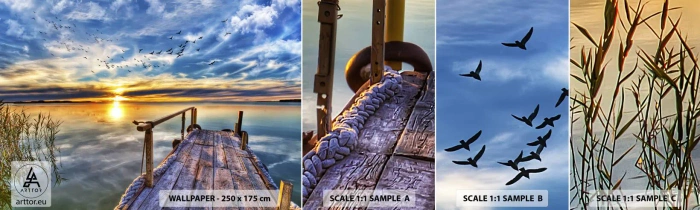 Fototapet Prov Standard Eco - Vinden lägger sig - Landskap, Sjö, Träbro - 100x30 cm