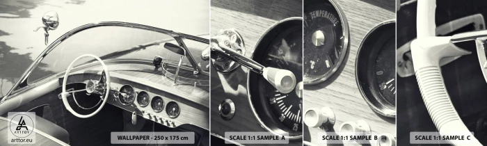Fototapet Prov Standard Eco - Väder för de rika - Vintage båt, Motorbåt, Svartvitt - 100x30 cm