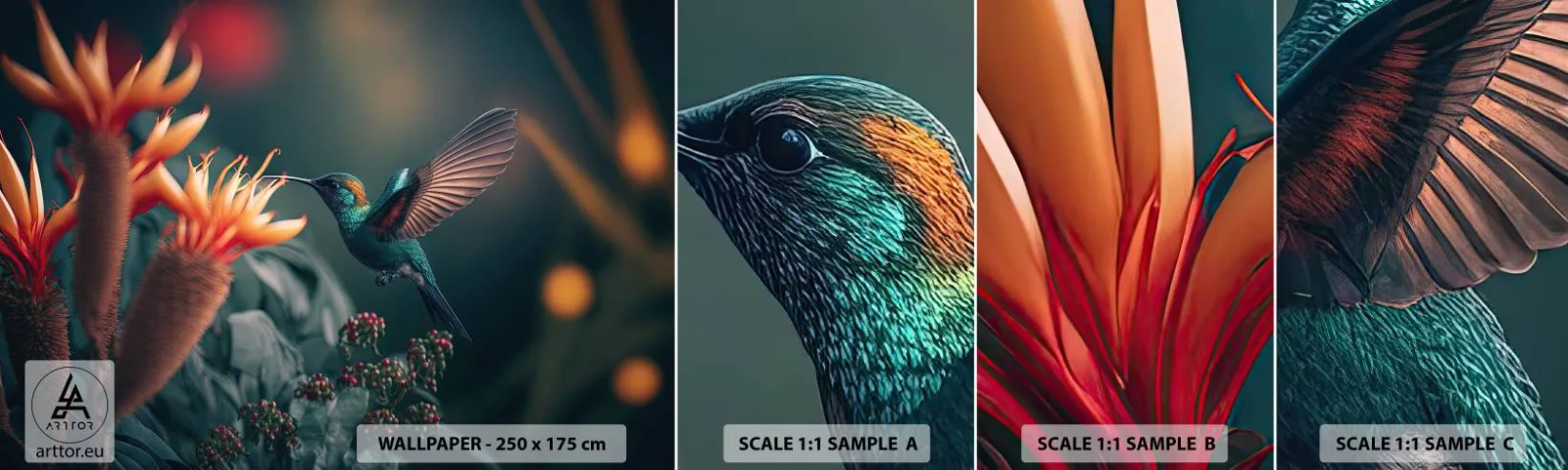 Fototapet Prov Standard Eco - Ett verkligt färgglatt liv - Fågel, Exotisk, Blomma - 100x30 cm