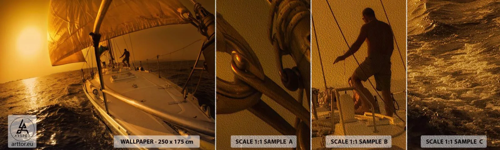 Provbit av fototapet Premium Sand - Gyllene kväll efter en färgrik dag - Maritime studier, Segelbåt, Resor - 100x30 cm