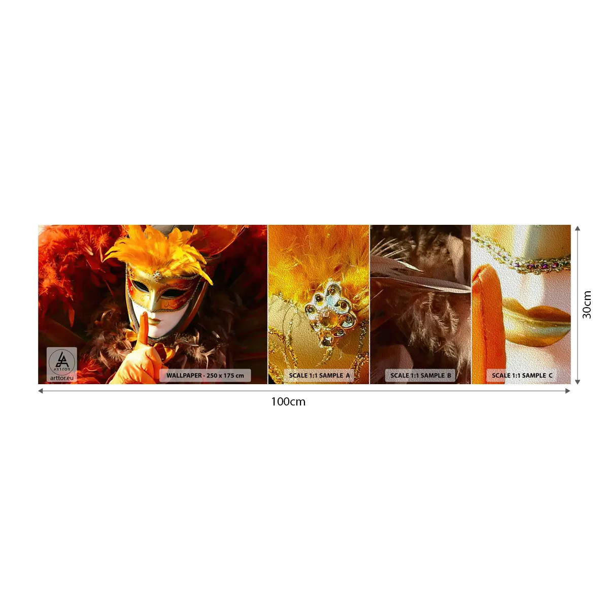 Provbit av fototapet Premium Sand - Hemligheten är en del av spelet - Venetiansk mask, Bit, Venedig - 100x30 cm