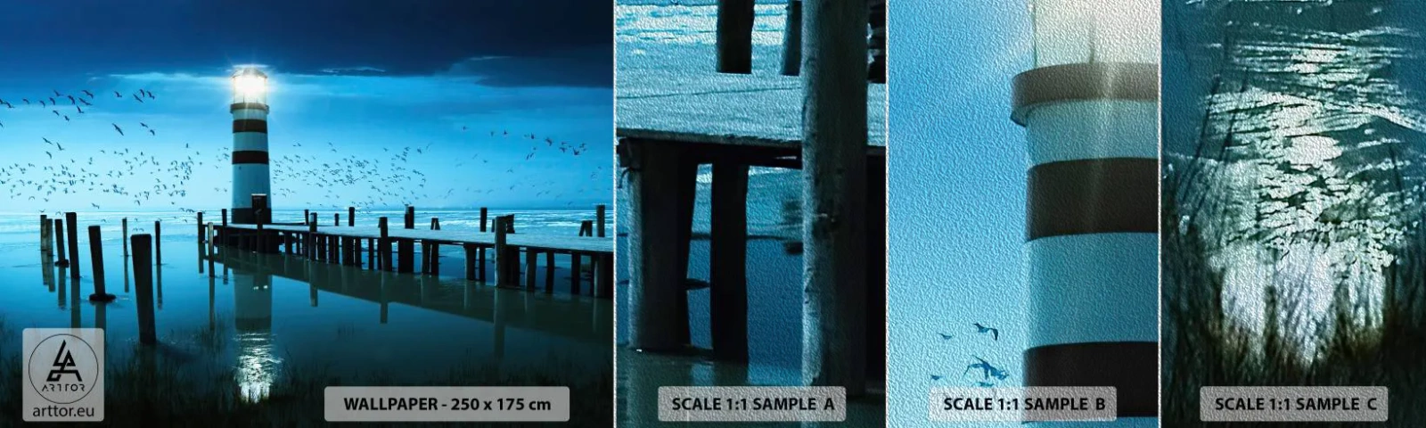 Provbit av fototapet Premium Sand - Och du är inte längre rädd för mörkret - Landskap, Fyr, Träbro - 100x30 cm