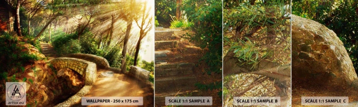 Provbit av fototapet Premium Sand - Från bron till sagoskogen - Landskap, Stentrappa, Solens strålar - 100x30 cm