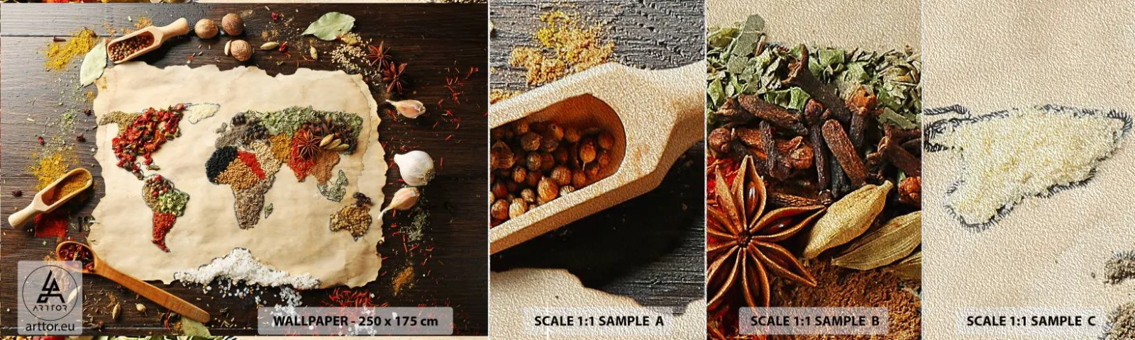 Provbit av fototapet Premium Sand - Världens alla smaker - Gastronomi, Världskarta, Torkade kryddor - 100x30 cm