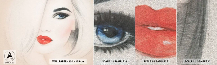 Provbit av fototapet Premium Sand - Hypnotiserar och bedårar - Porträtt av en kvinna, Kvinnans ansikte, röda läppar - 100x30 cm