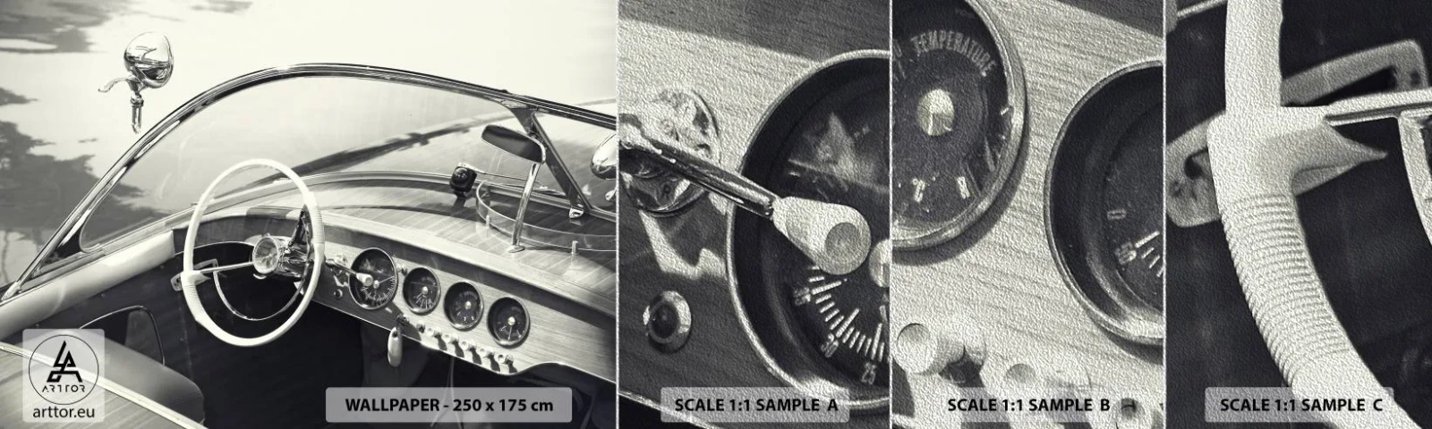 Provbit av fototapet Premium Sand - Väder för de rika - Vintage båt, Motorbåt, Svartvitt - 100x30 cm