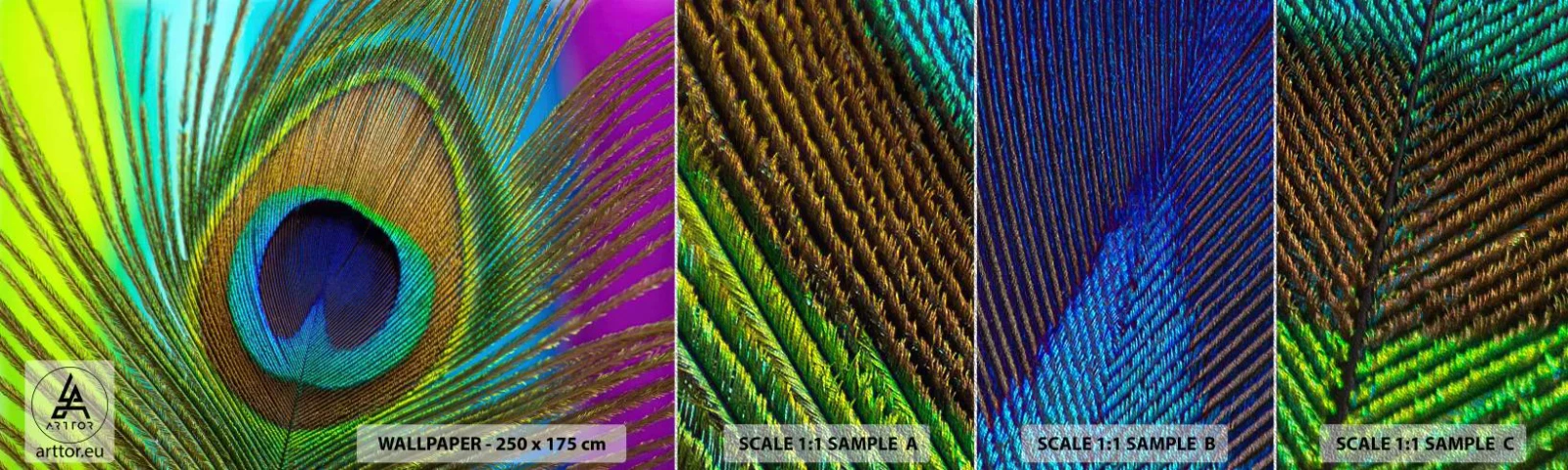 Provbit av fototapet Premium Sand - Öga mot öga - Abstraktion, Påfågel fjäder, Bit - 100x30 cm