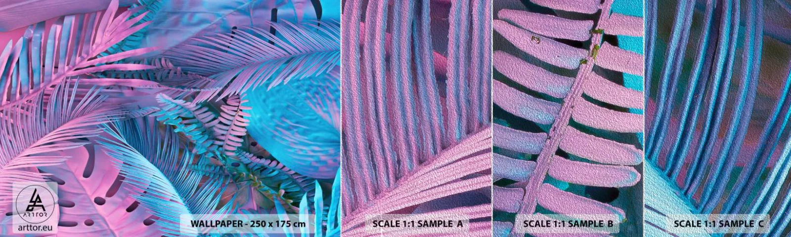 Provbit av fototapet Premium Sand - Tropiken i rosa och blått - Abstraktion, Löv, Tropisk växt - 100x30 cm