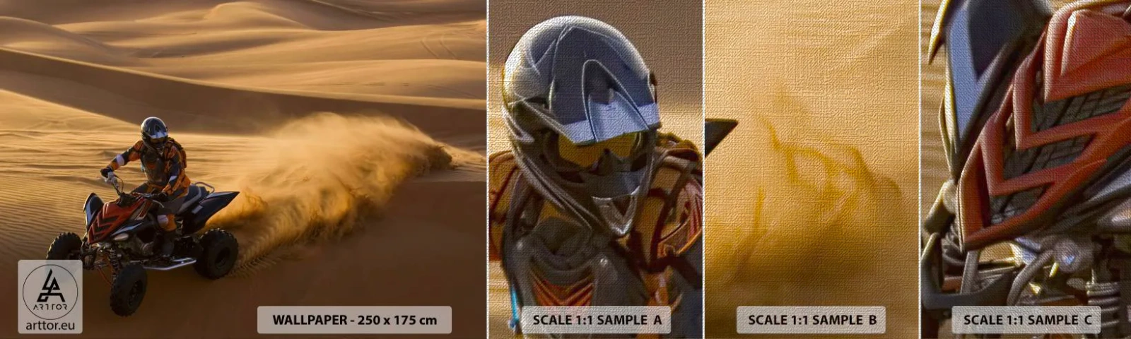 Innan du bestämmer dig för en fototapet i full storlek PREMIUM KANVAS , uppmuntrar vi dig att beställa ett materialprov i följande dimensioner:100x30 cm Tack vare provet kan du kontrollera materialets kvalitet live, se färgåtergivningen, känna ytstrukturen och bedöma tjockleken på materialet, vilket hjälper dig att fatta ett välgrundat beslut om att välja den bästa fototapeten för din inredning.