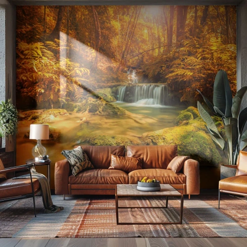 Fototapet Premium Canvas - Skogkaskad i gult - Landskap, Vattenfall, Thailand - 200x140 cm