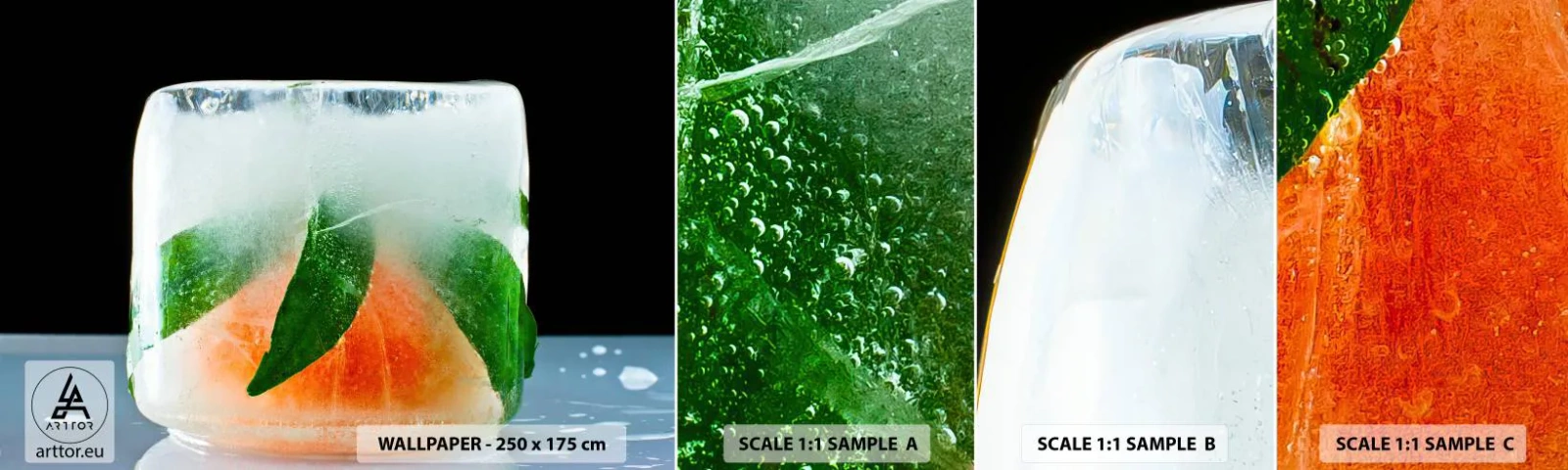 Provbit av självhäftande fototapet Deluxe Sticker - Fräschhet och svalka - Isbit, Orange, Mintlöv - 100x30 cm