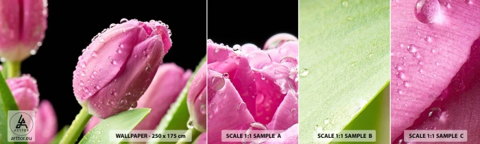 Provbit av självhäftande fototapet Deluxe Sticker - Lila sömn i daggen - Blommor, Tulpaner, Blombukett - 100x30 cm