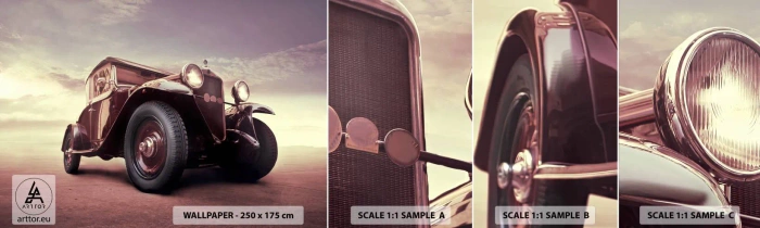 Provbit av självhäftande fototapet Deluxe Sticker - Vi kommer tillbaka som förr… - Bil, Retro bil, Årgång - 100x30 cm