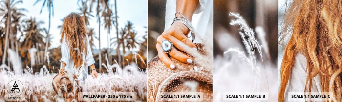 Provbit av självhäftande fototapet Deluxe Sticker - Född ur gräsdun - Kvinna, Årgång, Boho - 100x30 cm