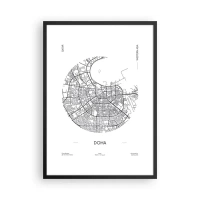 Affisch i svart ram - En minimalistisk svartvit karta över Doha - 50x70cm - Dohas anatomi - Modern väggdekoration för vardagsrum och sovrum ARTTOR