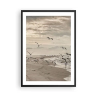Affisch i svart ram - Måsar som svävar över havsstranden under en molnig himmel - 50x70cm - Havets brus, fågelsång - Modern väggdekoration för vardagsrum och sovrum ARTTOR