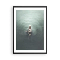 Affisch i svart ram - En person i en båt som flyter på vatten som speglar himlen och molnen. - 50x70cm - Livet - resan - det okända - Modern väggdekoration för vardagsrum och sovrum ARTTOR