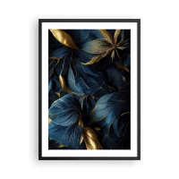 Affisch i svart ram - Gyllene blad mot en djup marinblå bakgrund - 50x70cm - Fodrad med guld - Modern väggdekoration för vardagsrum och sovrum ARTTOR