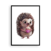 Affisch i svart ram - En söt igelkott som håller en färgglad muffin - 50x70cm - Varje dag är helgdag - Modern väggdekoration för vardagsrum och sovrum ARTTOR