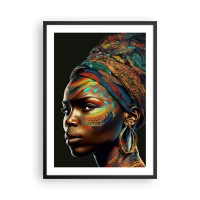 Affisch i svart ram - Porträtt av en kvinna i en färgglad halsduk och etnisk smink - 50x70cm - Afrikansk drottning - Modern väggdekoration för vardagsrum och sovrum ARTTOR
