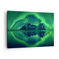 Canvastavla - Bild på duk - Berg omgivna av norrsken som speglas i vattnet - 70x50cm - I skenets famn - Modern väggdekoration för vardagsrum och sovrum ARTTOR