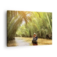 Canvastavla - Bild på duk - En båt på en flod omgiven av tropisk vegetation - 70x50cm - Genom en palmravin - Modern väggdekoration för vardagsrum och sovrum ARTTOR