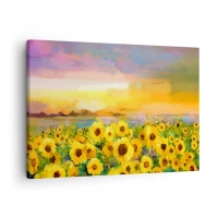Canvastavla - Bild på duk - Ett fält av solrosor i ljuset av den nedgående solen - 70x50cm - Själva solen gick ner på jorden - Modern väggdekoration för vardagsrum och sovrum ARTTOR